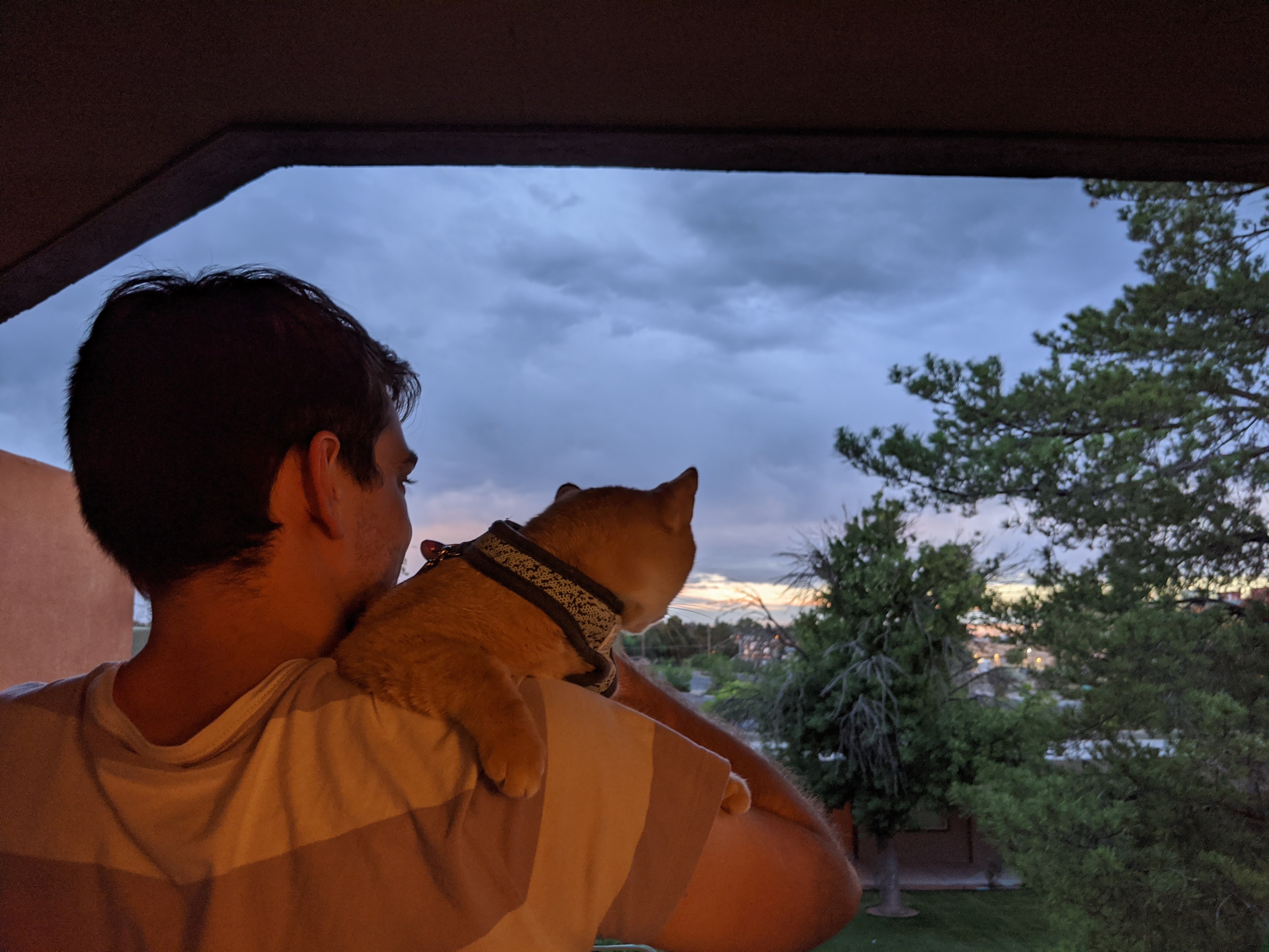 Chris showing our cat, Spoon, the sunset (2020)